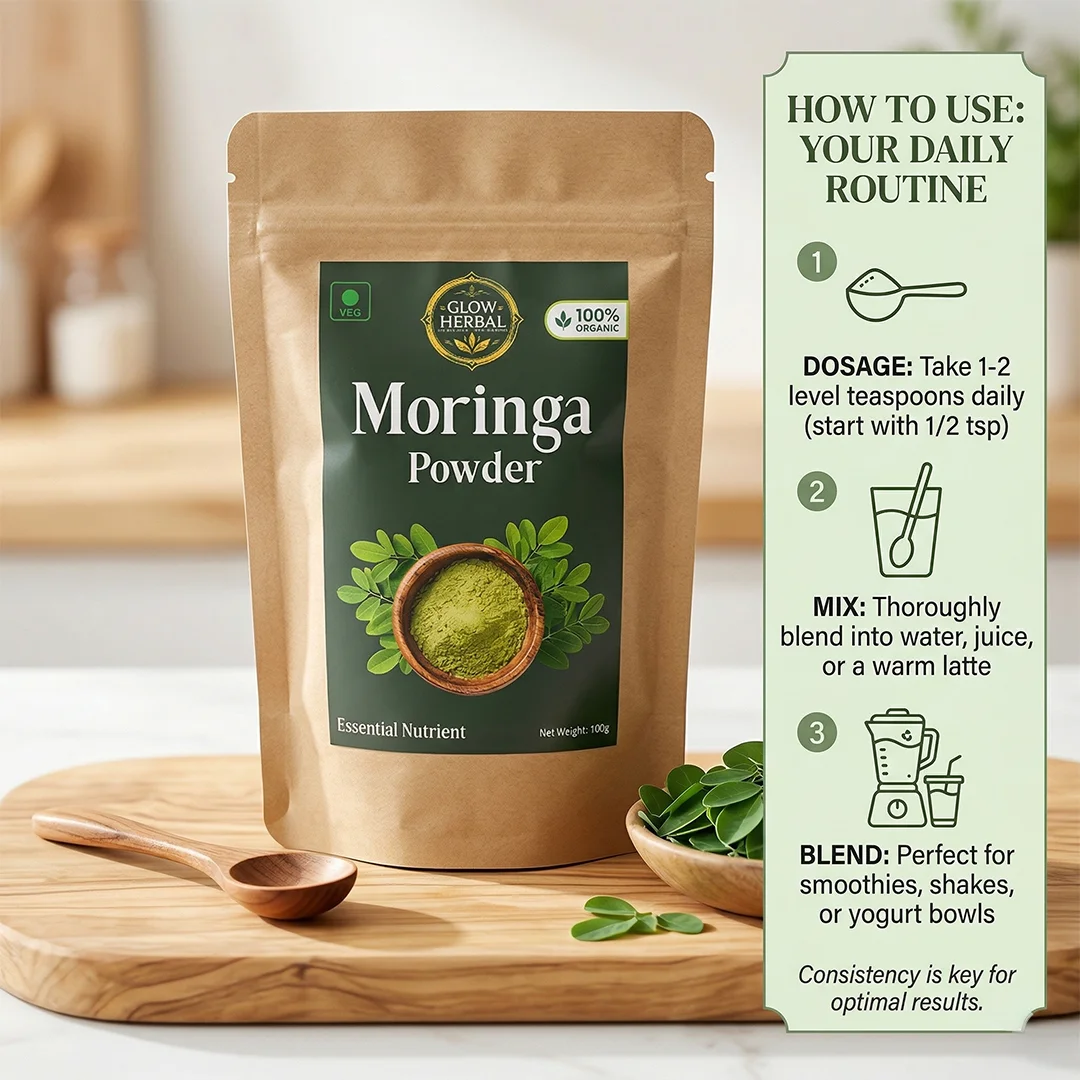 Glow Herbal's Moringa Powder is derived from 100% organically cultivated Moringa oleifera leaves. The leaves are shade-dried at low temperatures to preserve their complete nutritional profile, then stone-milled into a fine, vibrant green powder.