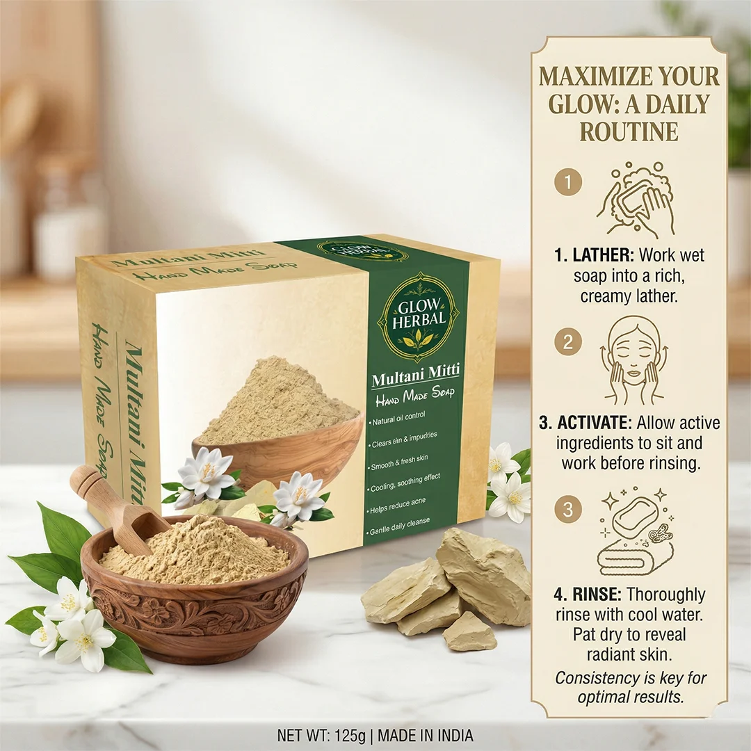 Crafted in Roorkee using traditional cold-process saponification, our Multani Mitti Herbal Soap retains all the natural glycerin and active minerals that commercial soaps strip away. Enriched with Fuller's Earth, each bar is cured for a minimum of 4 weeks for a long-lasting, silky-smooth lather.
